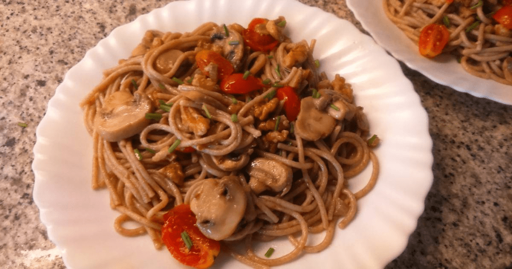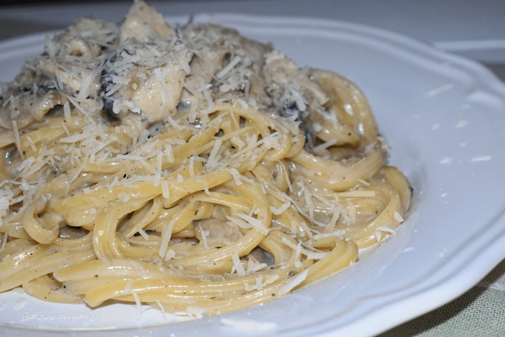 Espagueti con pollo jugoso y champiñones frescos, acompañados de una suave salsa cremosa