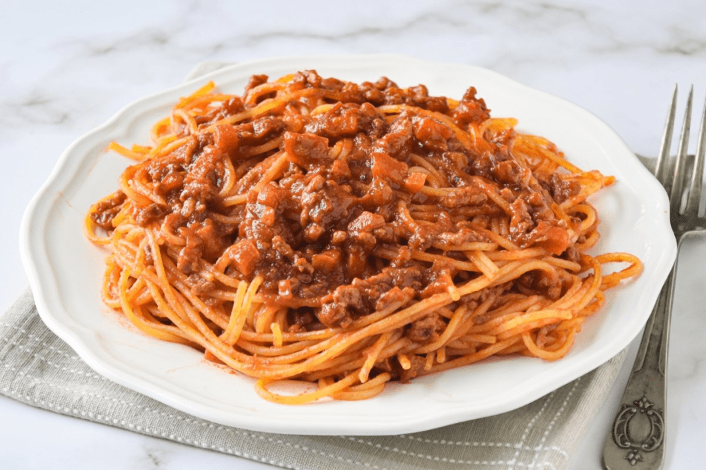 Espagueti con salsa boloñesa, una rica mezcla de carne, tomate y hierbas.