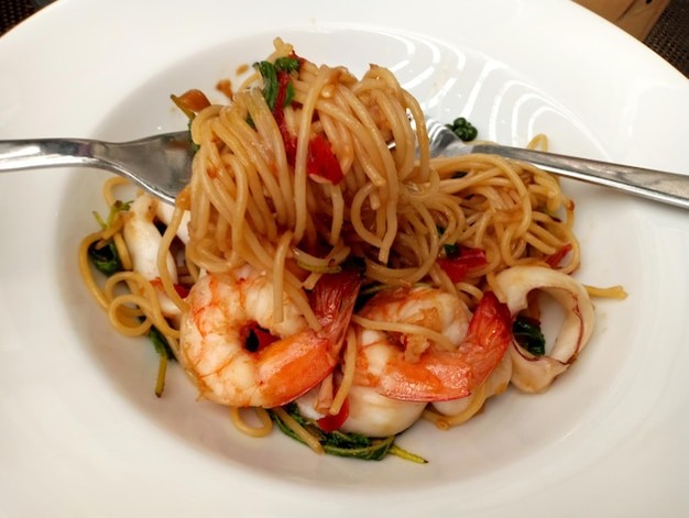 Espagueti marinero con mariscos frescos y salsa de tomate, una explosión de sabores marinos.